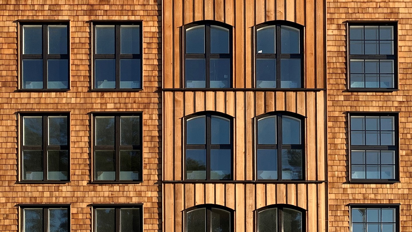 Detta klimatsmarta NollCO2-certifierade flerbostadshus med KL-trästomme, solceller och återbrukade fönster finns på en tomt strax söder om Uppsala.